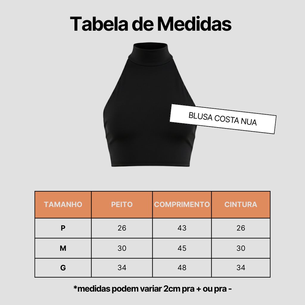 Aposte na elegância da Blusa Costa Nua, confeccionada em suplex (92% poliéster, 8% elastano). Com um super decote nas costas, esta peça é perfeita para os dias mais quentes, trazendo um ar fashionista ao seu visual. Essencial para compor looks modernos e sofisticados.