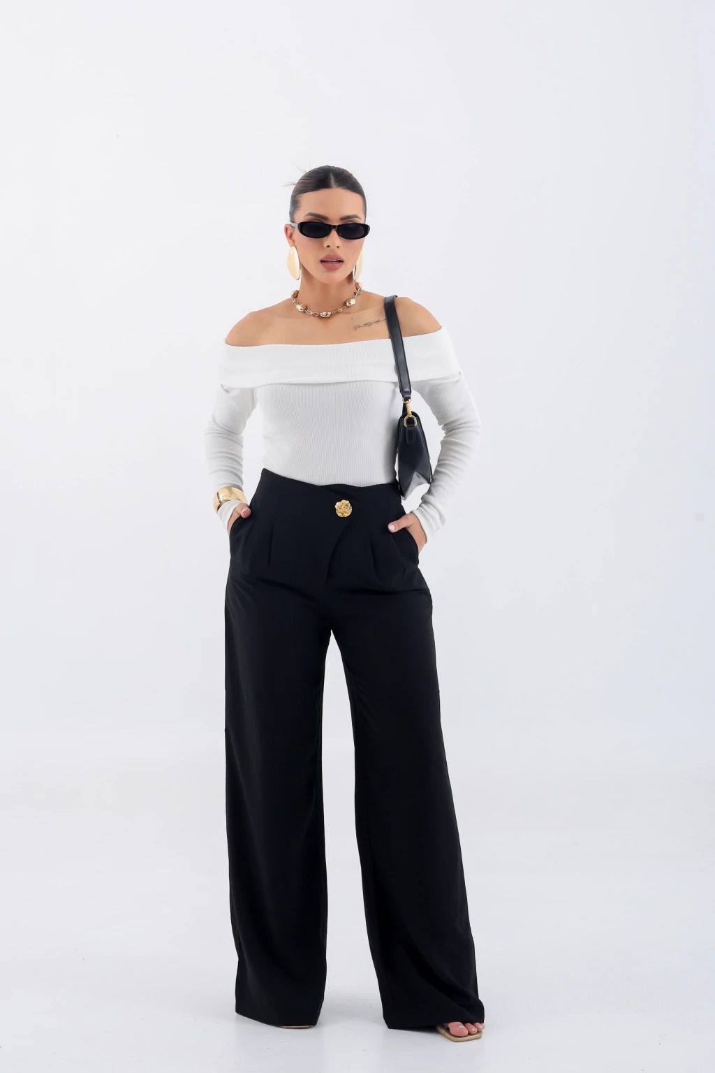 Possui cintura alta que valoriza a silhueta e recorte frontal levemente transpassado, finalizado por um botão dourado sofisticado — detalhe que faz toda a diferença no visual. As pregas sutis na parte frontal proporcionam um caimento fluido e elegante, enquanto o corte reto com barra ampla garante movimento e alonga a silhueta.