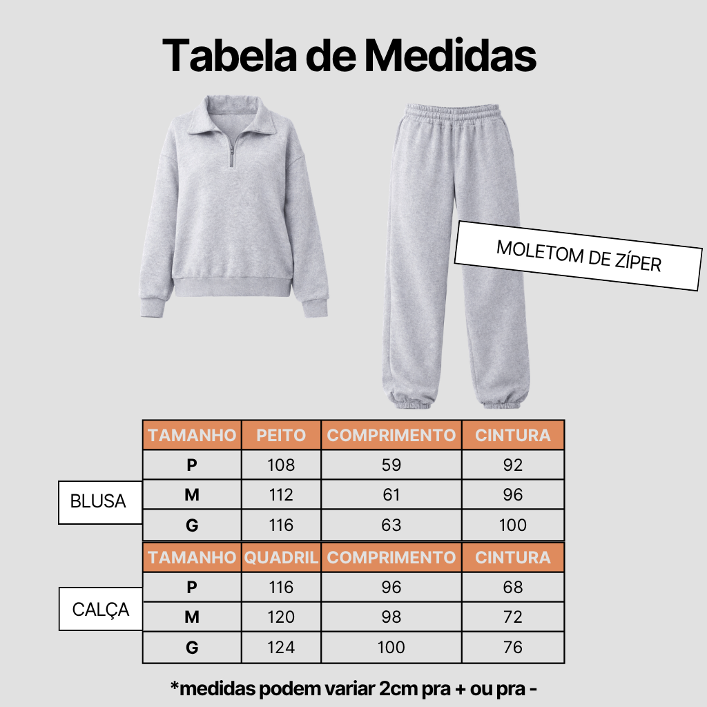 A blusa possui gola com zíper frontal, trazendo um visual moderno e versátil, enquanto a calça conta com modelagem confortável e bolsos funcionais, perfeita para o dia a dia.
