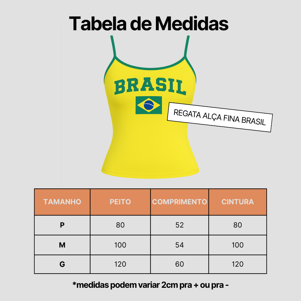 Exalte o orgulho nacional com elegância usando a Regata Alça Fina Brasil! Produzida em tecido suplex, essa peça traz as cores vibrantes da nossa bandeira e uma modelagem incrível, valorizando qualquer produção. Ideal para quem busca conforto, caimento impecável e estilo em todas as ocasiões. Arrase e destaque-se com brasilidade!