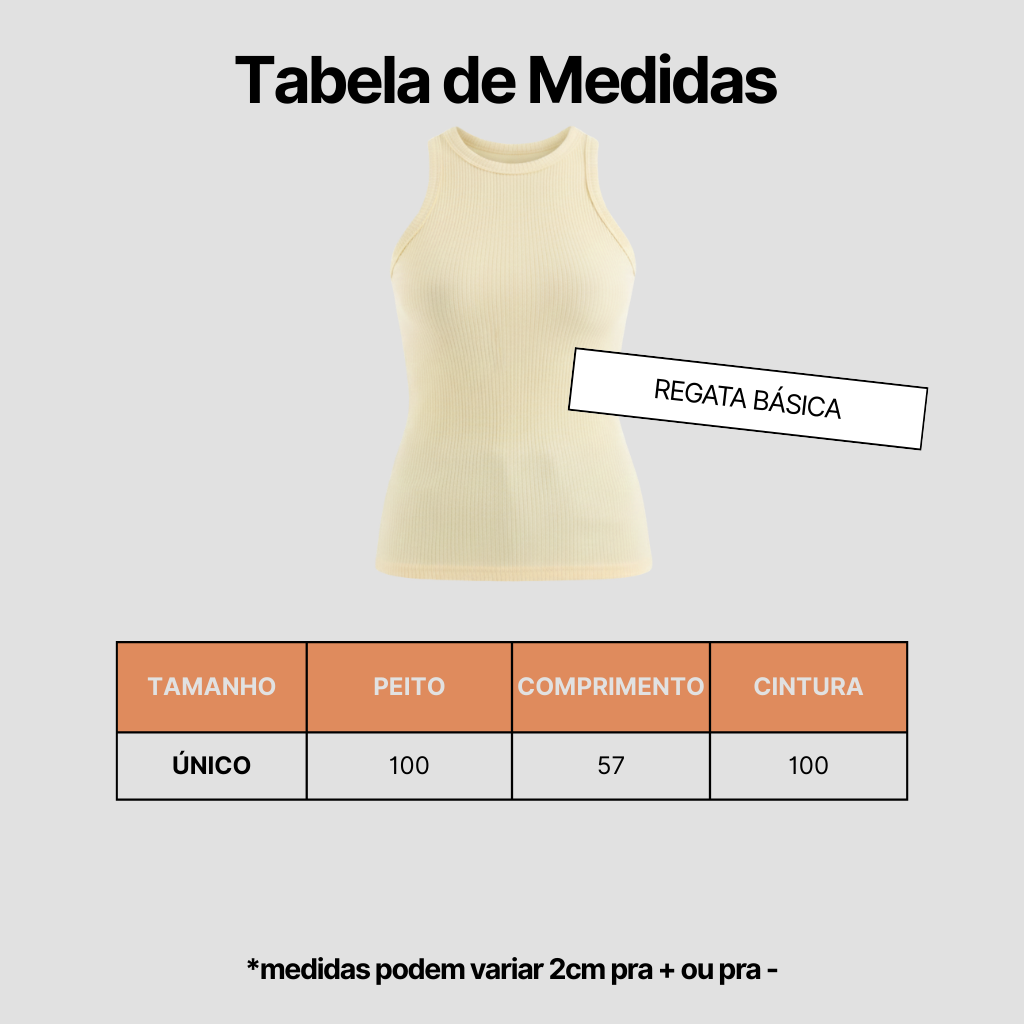 Eleve seu estilo com a Regata Básica! Confeccionada no tecido Ribana (50% algodão, 47% poliéster, 3% elastano), esta peça é o must-have no seu guarda-roupa. Versátil e atemporal, é perfeita para compor looks elegantes e descomplicados.